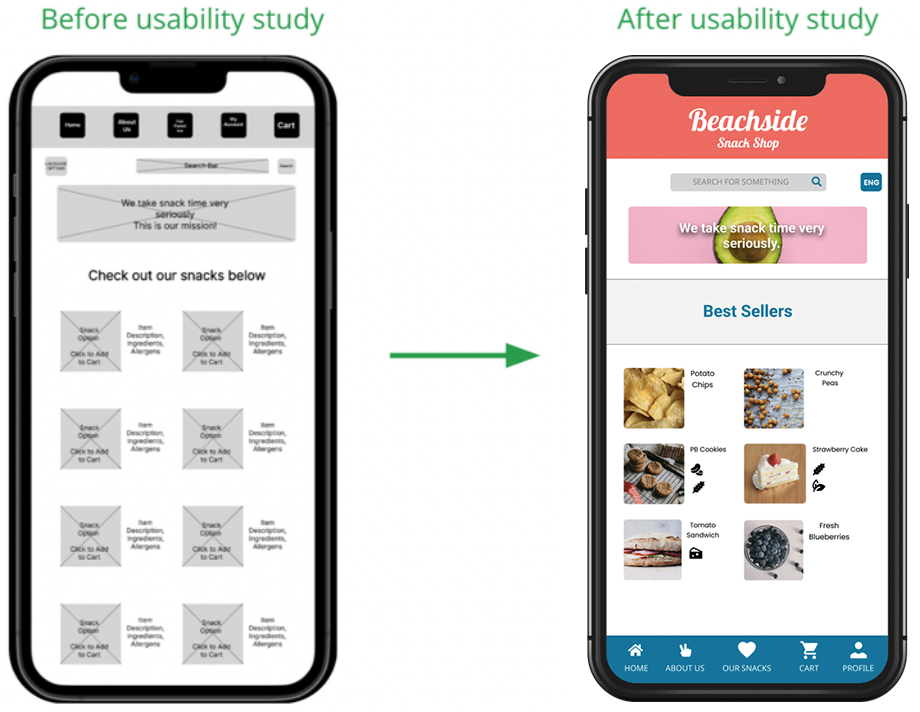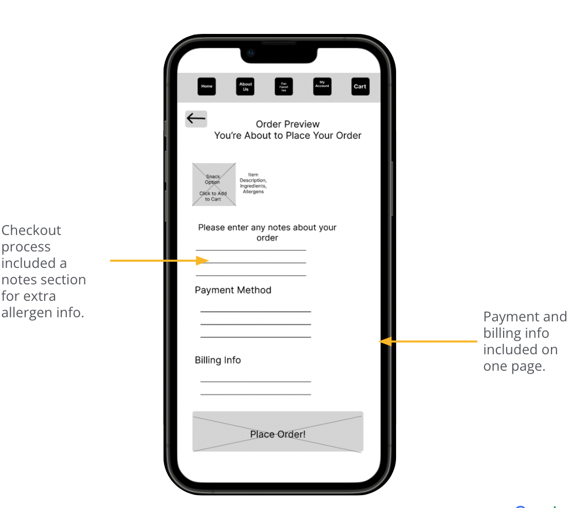 The data I gathered from user interviews pointed to many users with allergies and dietary restrictions struggling with other snack shop and restaurant apps. There was a clear need for users to be able to see ingredients and allergens up front. This led to my proposed goal and solution…