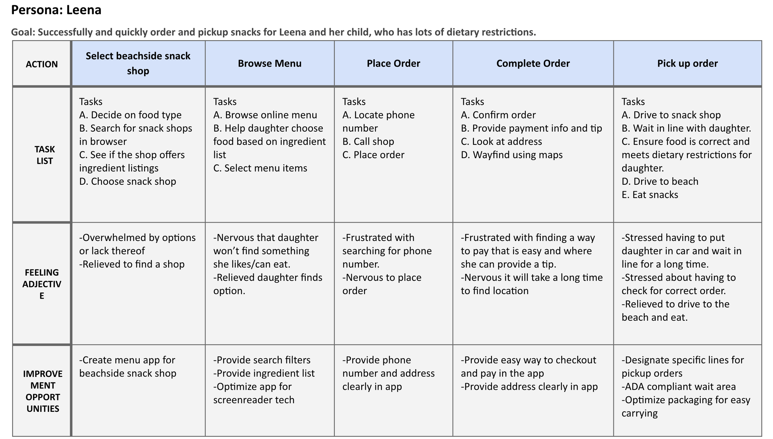 Leena’s user journey helped me to understand how helpful it would be to have allergens listed clearly on a snack app for users.